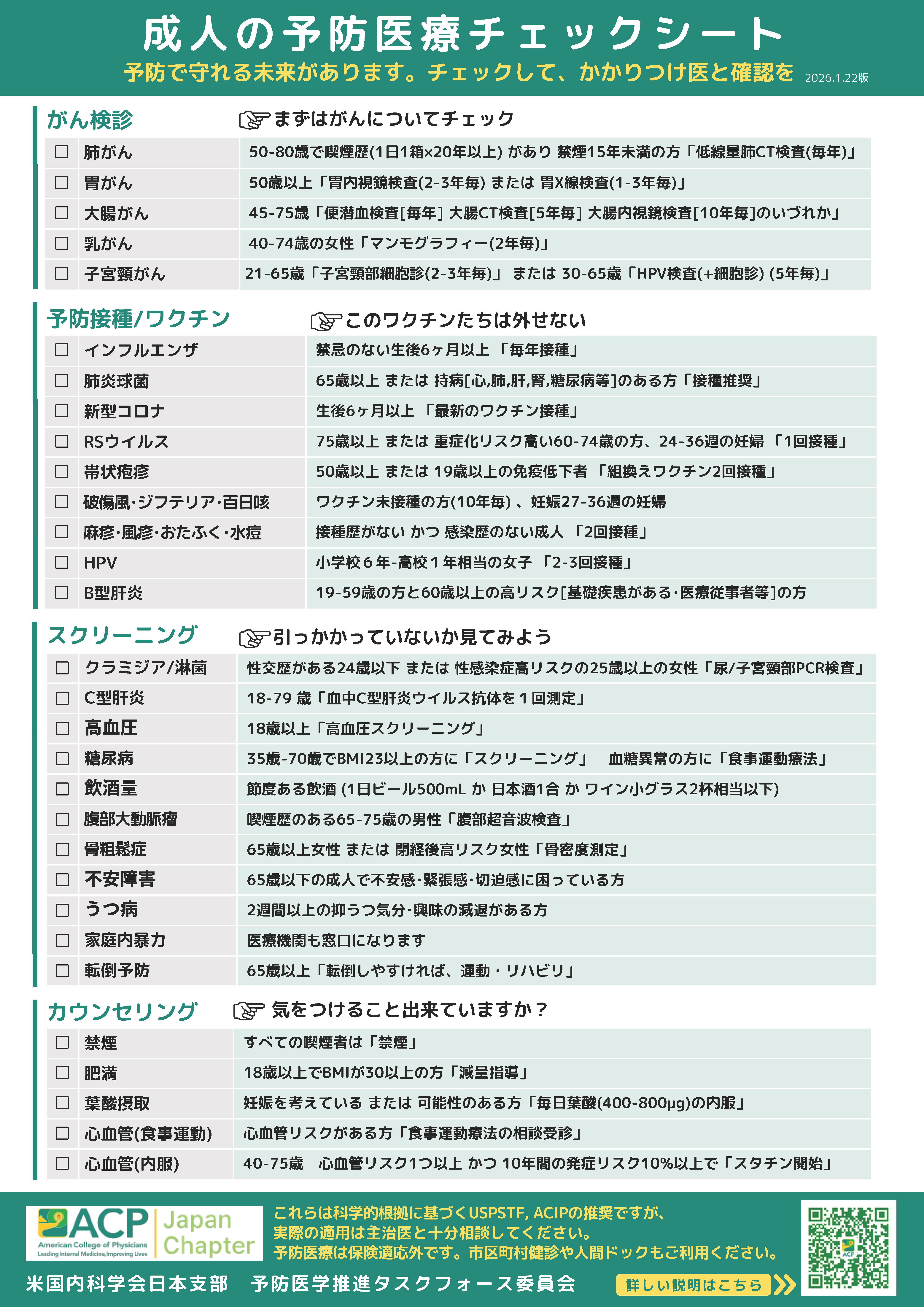「成人の予防医療チェックシート2026」はこちらからダウンロードできます。