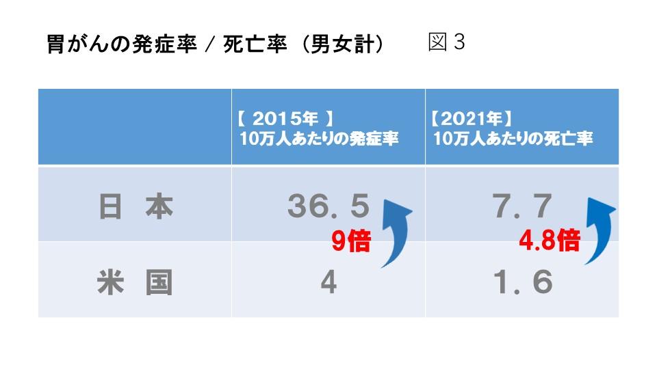 このように米国における胃がんの発症率は日本の約9分の1であり、死亡率は約5分の1と日本を含めた他の地域と比べて低いため(図3)